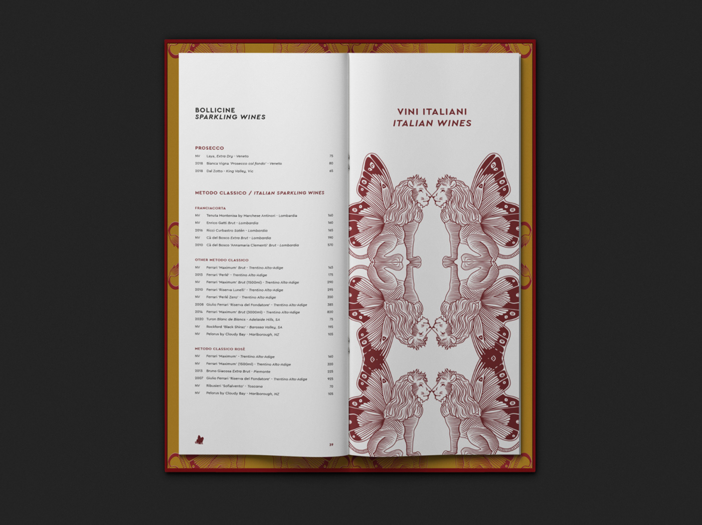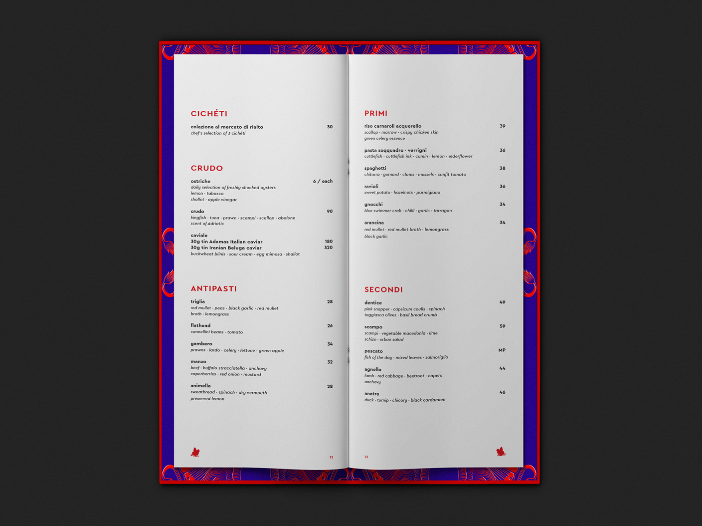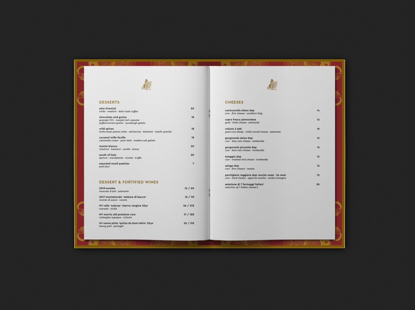 A bold colour palette dominated by red was developed and used to create the different restaurant menus, combined with a refined texture to enhance the brand’s elegant and decorative character.
