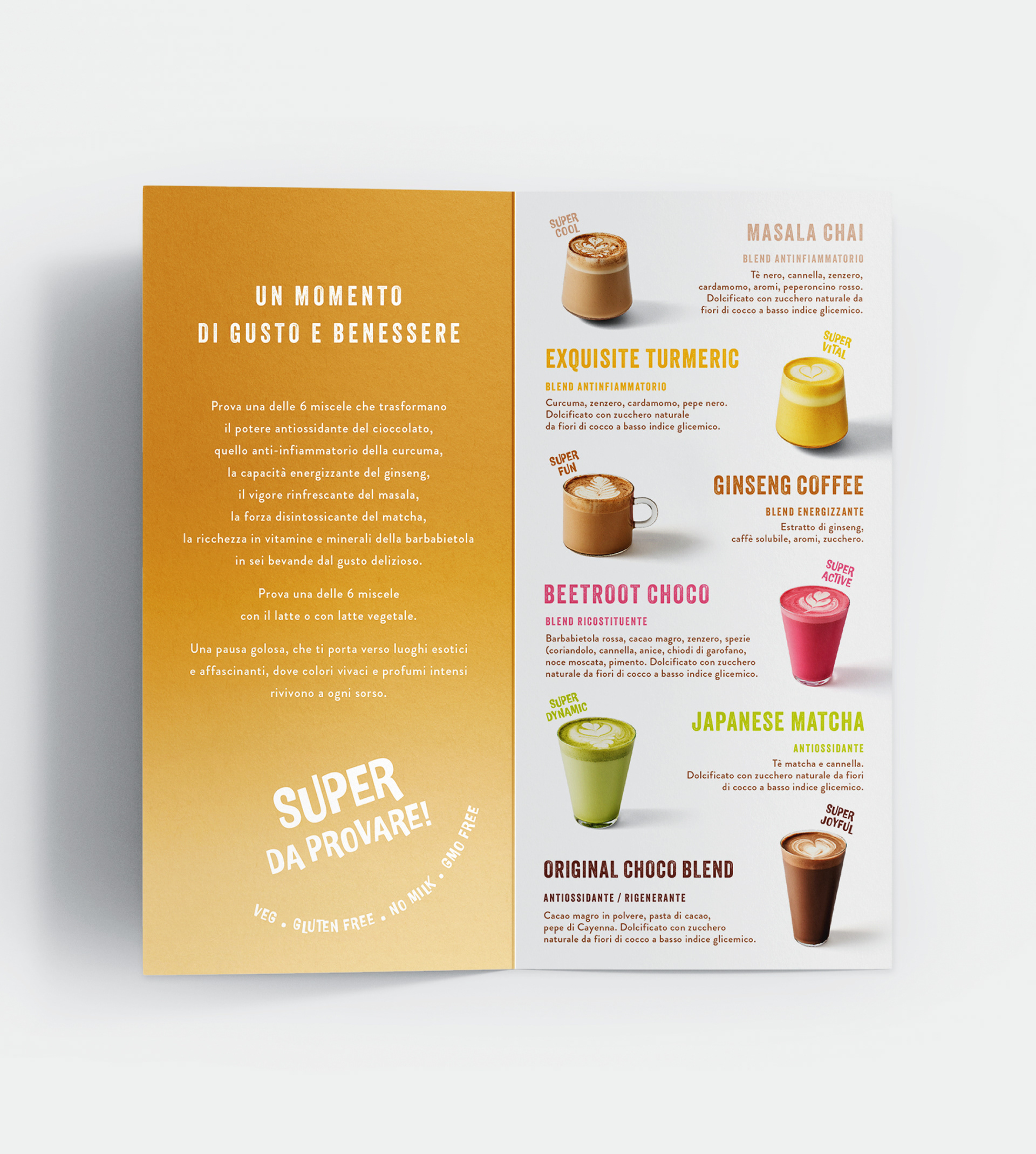 The products are functional superfood blends designed to be mixed with milk or plant-based drinks,